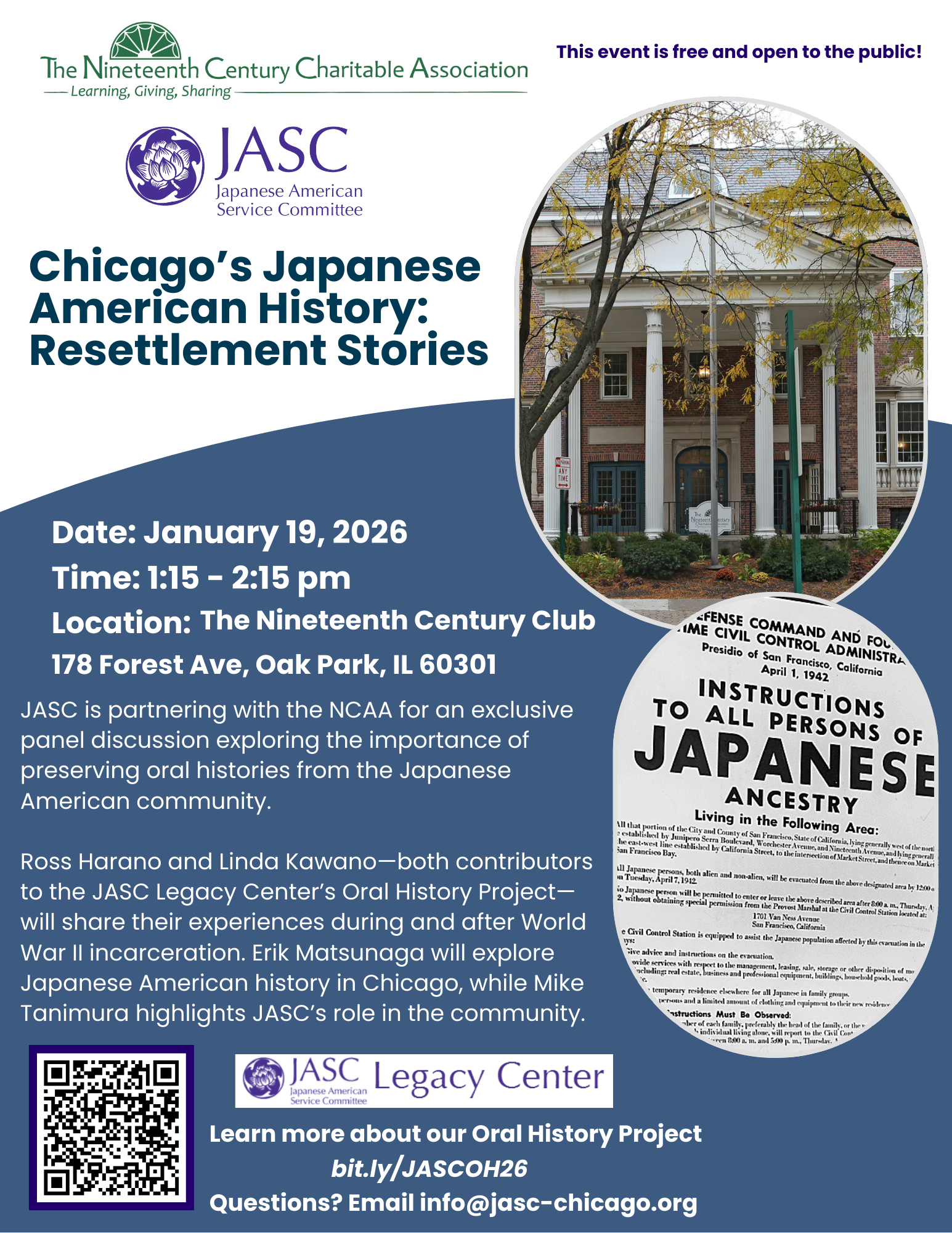 Ross Harano and Linda Kawano—contributors to the JASC Legacy Center’s Oral History Project—will share personal stories from their experiences during and after World War II incarceration. Erik Matsunaga will provide historical context on Japanese American resettlement in Chicago, and Mike Tanimura will speak to JASC’s enduring role in supporting and strengthening the community.