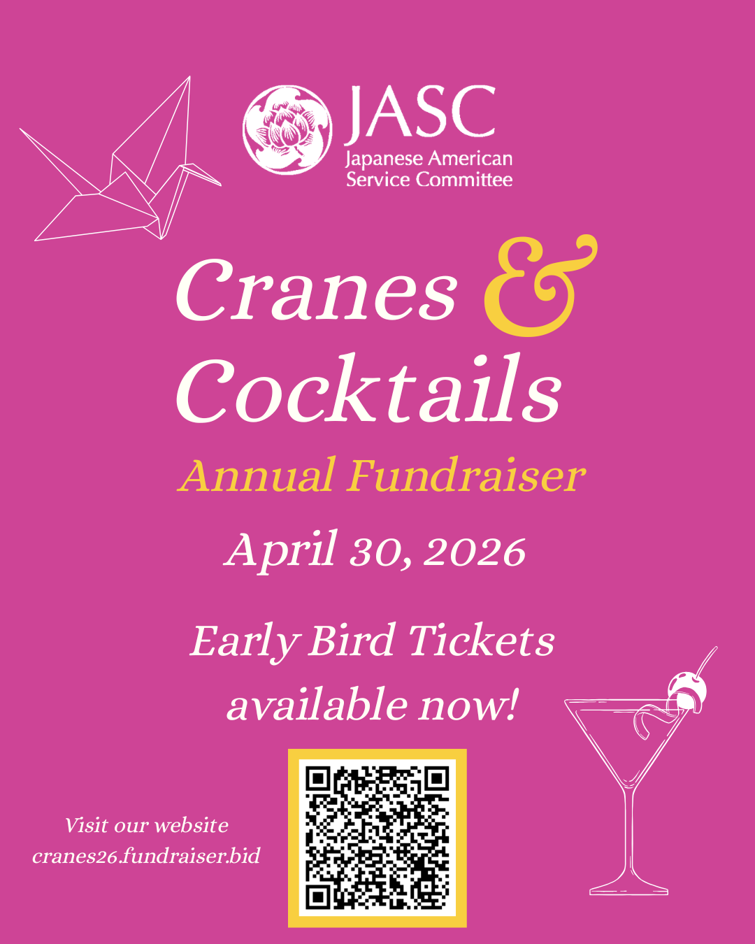 The countdown is on! Early Bird tickets for Cranes & Cocktails are on sale now, but only for a limited time. Grab yours early and be part of an unforgettable evening as we kick off JASC’s 80th year of service in style.