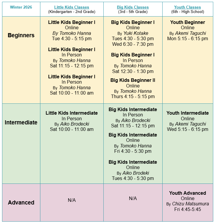 Please email (dongurikai@jasc-chicago.org) to consult with Donguri Kai teachers if you are unsure which class to sign up for.
